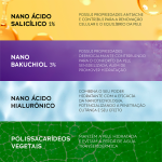 Água, triglicerídeo caprílico/cáprico, glicerol, óleo de girassol, isopropanolamina, pidolato de zinco, fenoxietanol, copolímero de acrilatos de sódio, polipropilenoglicol-5-polietilenoglicol-20 éter de álcool cetílico, glicerol, ácido poliacrílico, goma xantana, lecitina, sesquicaprilato de xilitila, monoestearato de glicerila, hidróxido de sódio, caprililglicol, edetato dissódico, decilenoglicol, poloxaleno, extrato de casca de anadenanthera colubrina, fitantriol, cera de euphorbia cerifera, polissorbato 80, estearato de sorbitana, arginato pidolato de etil cocoíla, sorbato de potássio, ácido hialurônico, bacuchiol, tocoferol, ácido salicílico.
